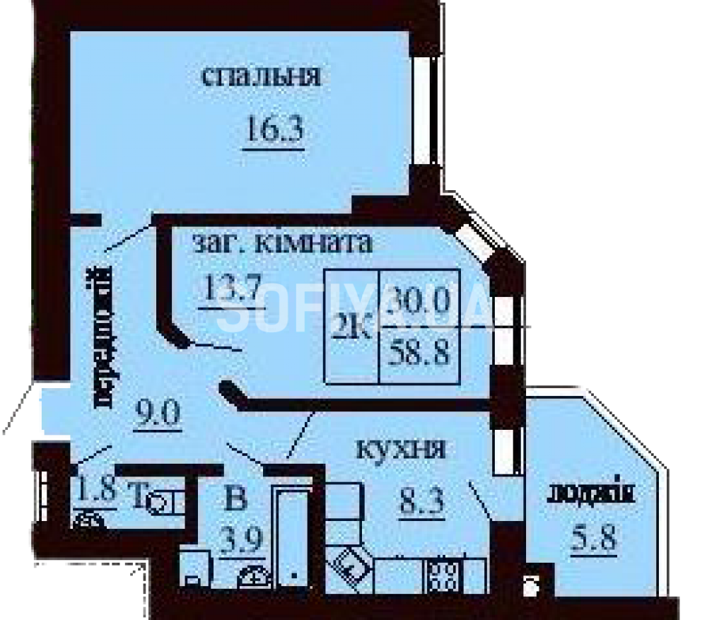 2-х комнатная квартира 58.8 м/кв