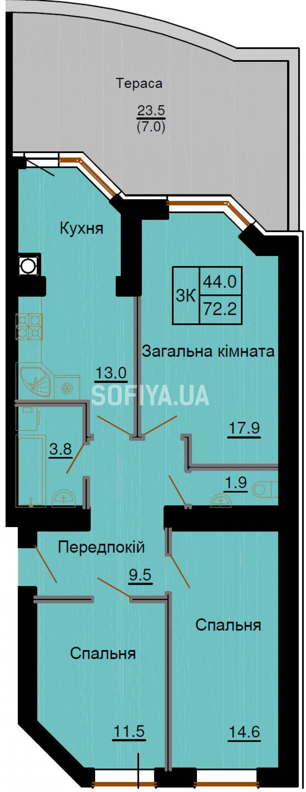 Трехкомнатная квартира 72,2 м/кв