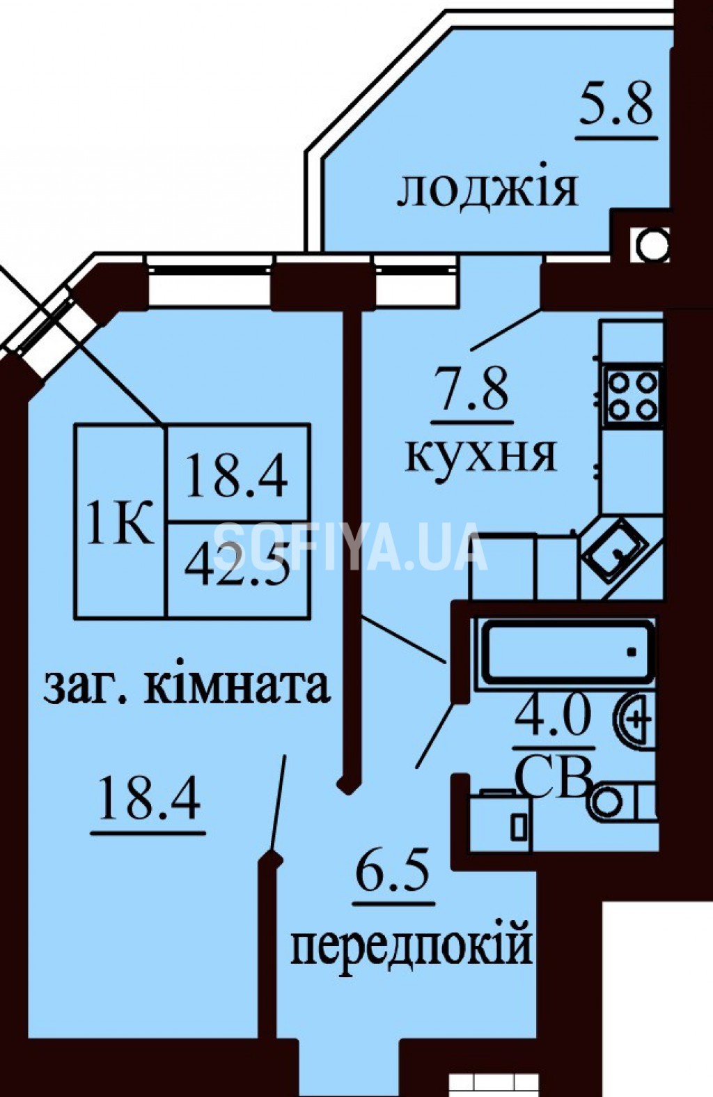 Однокомнатная квартира 42.5 м/кв